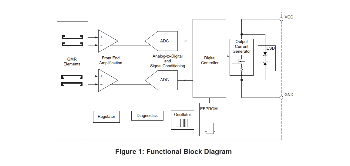 - GMR technology integrates high sensitivity MR (magnetoresistive) sensor elements and high precision BiCMOS circuits on a single silicon integrated circuit offering high accuracy, low magnetic field operation