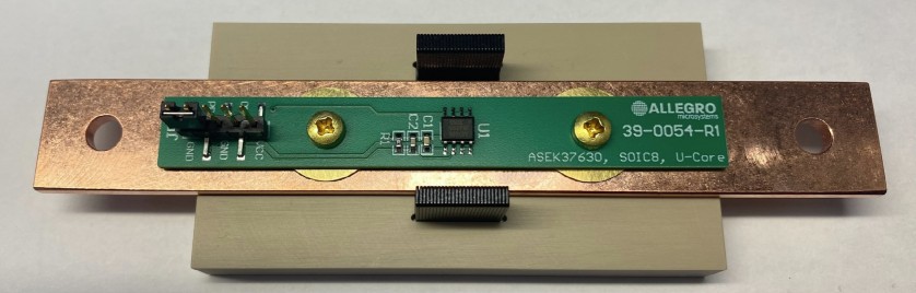 This evaluation board is designed for the 4 mV/G variant of the ACS37630 (sensor part number ACS37630LOLLU-004B5) with a full-scale output range of approximately ±860 A, or the 2.5 m V/G variant of the ACS37630 (sensor part number ACS37630LOLLU-2P5B5) with a full-scale output range of approximately ±1380 A. VCC, GND, and VOUT test points are available as header pins for ease of connection to lab equipment. Holes at either end of the busbar allow for M5 bolt connections to lugs and high-current cables.